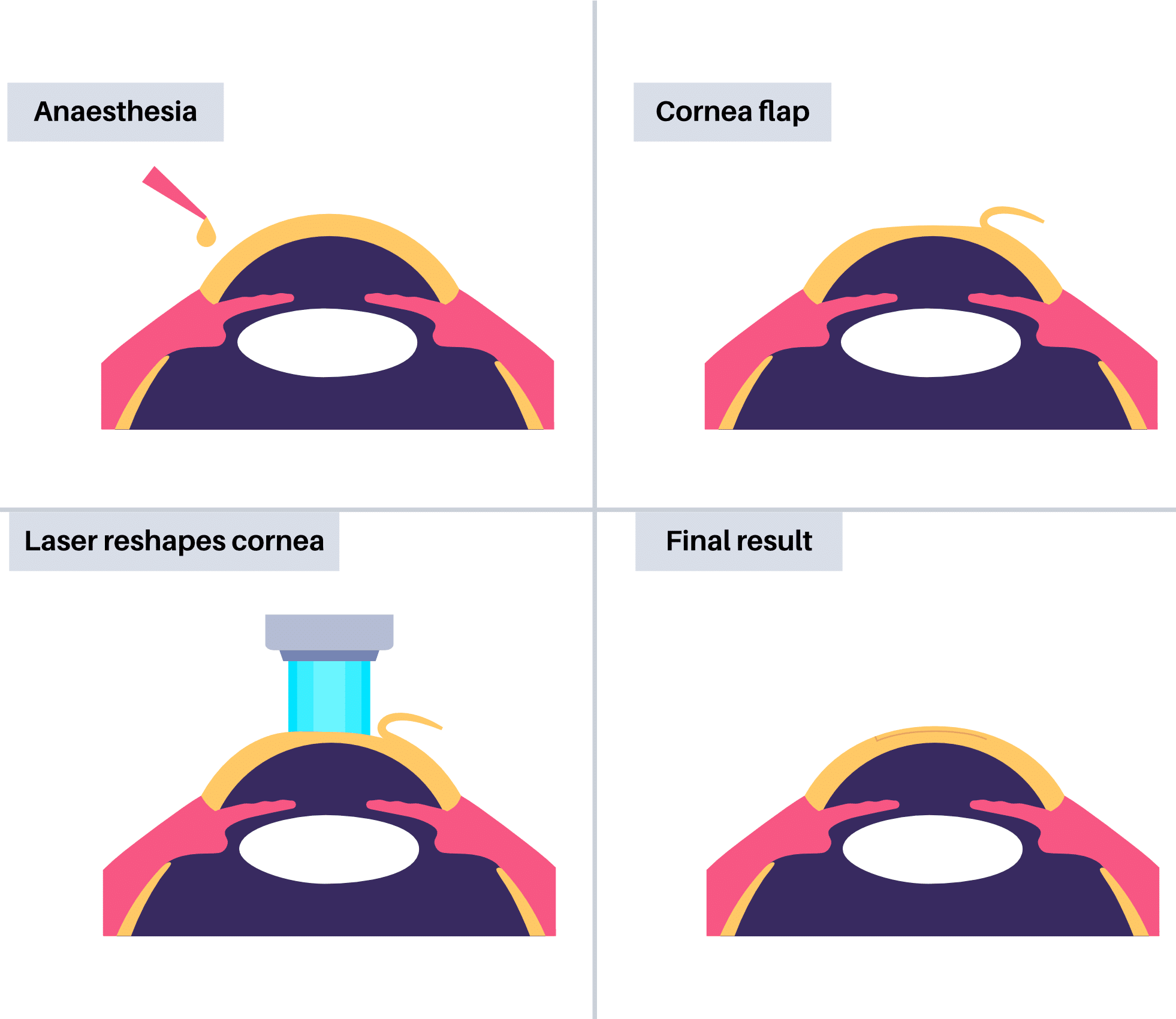 Le LASIK est une intervention courte, indolore et réalisée sous anesthésie locale (collyre anesthésiant). Elle se déroule en trois étapes clés, à l’aide de deux types de lasers :